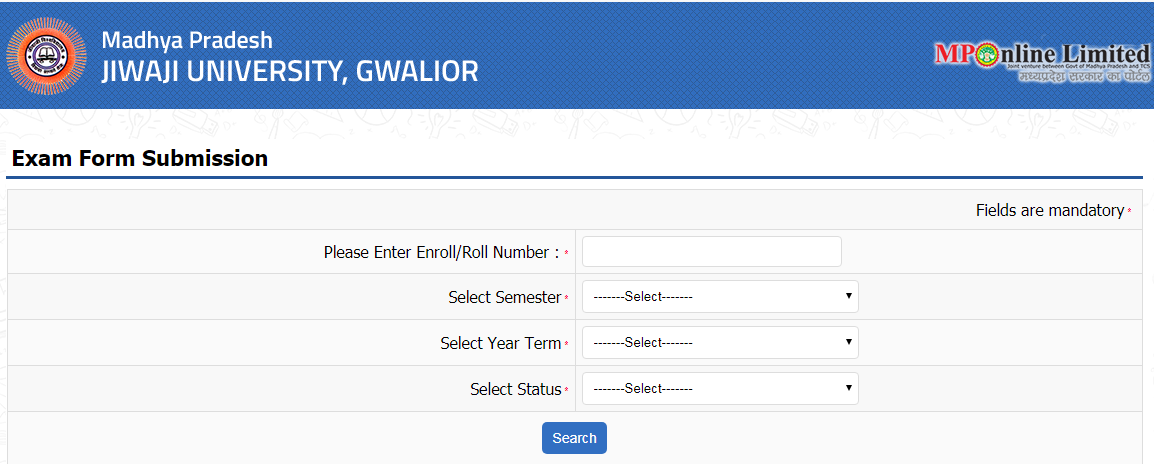 All the students who are looking to fill Jiwaji University BA BSc BCom 1st 2nd 3rd Year Online Exam Form 2024 2025. They all have to enter their Enroll/Roll Number. And Select Semester, Year Term, Status and click on Search button. Students can open given below direct links to get their Jiwaji University Online Exam Form.