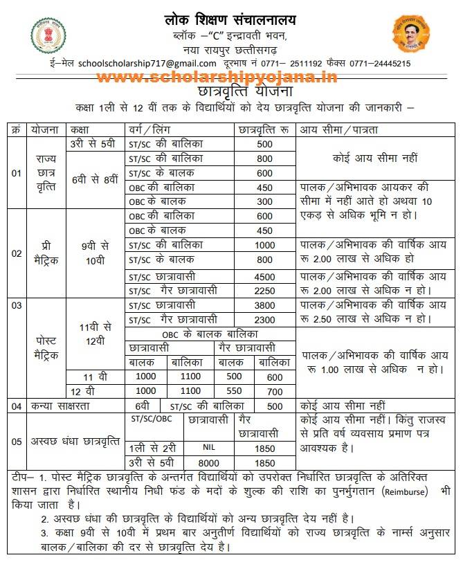 छत्तीसगढ़ सरकार राज्य में तीन प्रकार की स्कालरशिप प्रधान करवाती है | सभी पात्र विधार्थी नीचे दी गई स्कालरशिप के लिए आवेदन कर सकते है |