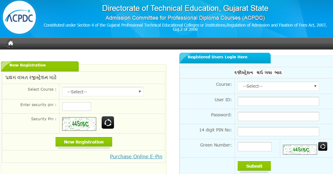 • Registered User Select Your Course, Input User ID & Password, 14 Digit PIN Number, Green No. or Capatcha Code followed by Submit.