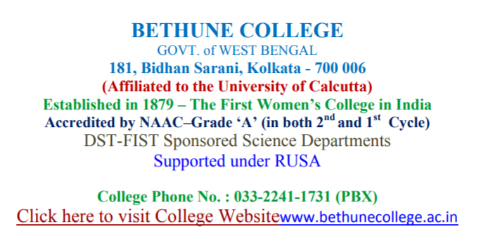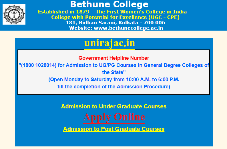 Bethune College Admission 2024-25 for UG Courses BA (Hons.) & BSc (Hons) in 1st Year Started Online. From Last week of May 2024 You can Apply Online for the Bethune College Kolkata Admission 2024-25. Only Female Candidates may Register for bethune College Admission in UG PG Courses. INR 150 Needed to submit in any Indian Bank Branch. Take a Printed Copy of Bethune College Online application form 2024 Page Submitted by you. for Bengali & English Honours Admission Test will conduct on Scheduled date. In Mid of june bethune College Merit List 2024 will Available Online. Submit Your Query for BA BSc Admission in Bethune College on “[email protected]“.