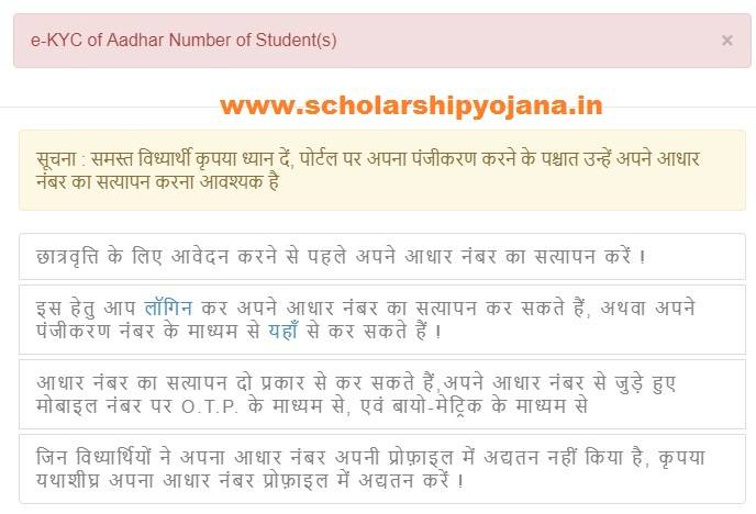 Candidates who applied for MP Scholarship 2024-25 have to update their Aadhar Number using E-KYC link available on this web page. Click here to do MP Scholarship e-kyc by providing Applicant ID and Date of Birth.